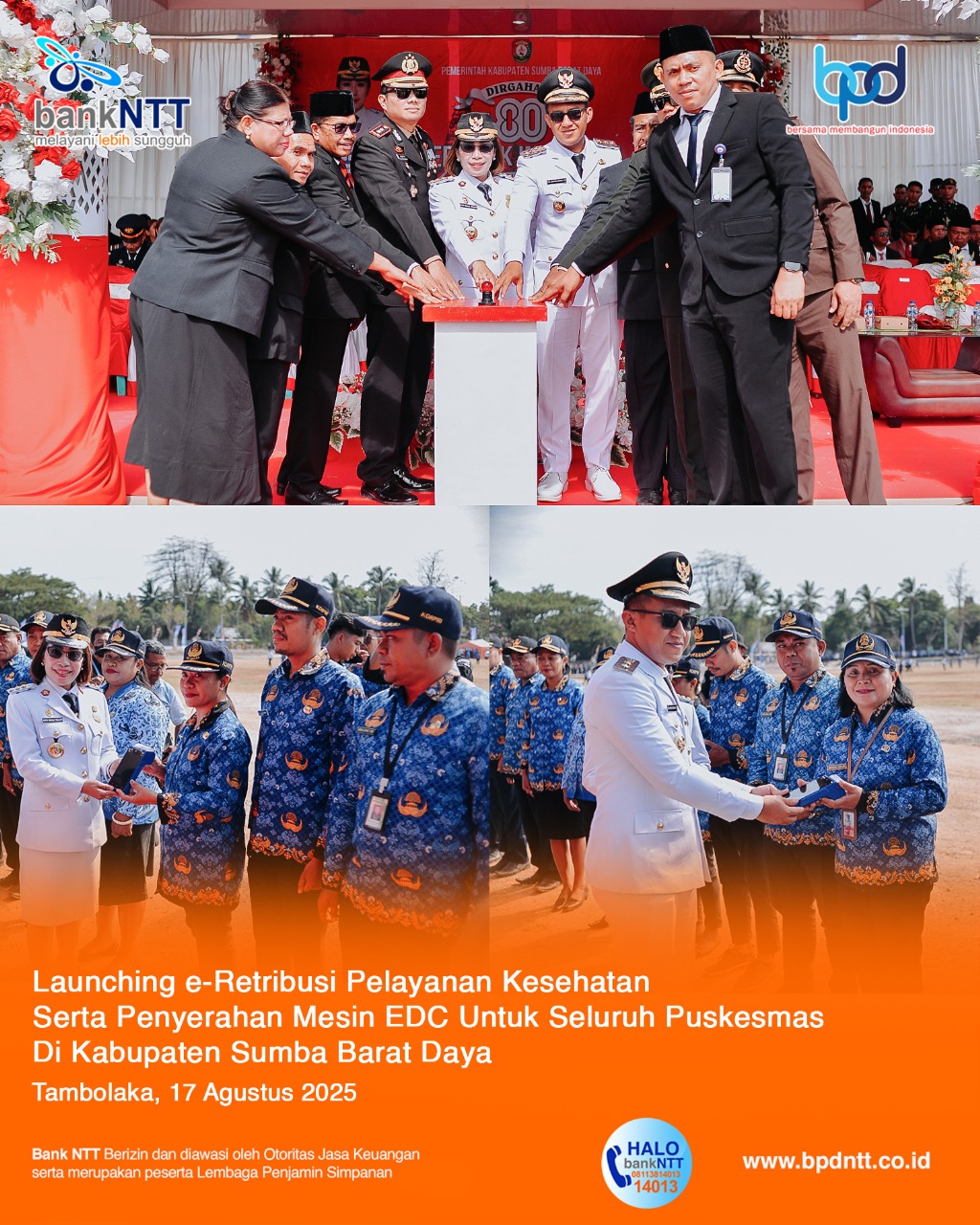 Selain itu, pada momentum HUT RI ke-80 ini juga dilakukan launching pelayanan E-Retribusi di Kabupaten Sumba Barat Daya. Dengan adanya layanan ini, seluruh transaksi retribusi di 16 puskesmas akan dilakukan secara non tunai, sehingga lebih transparan, cepat, dan akuntabel.