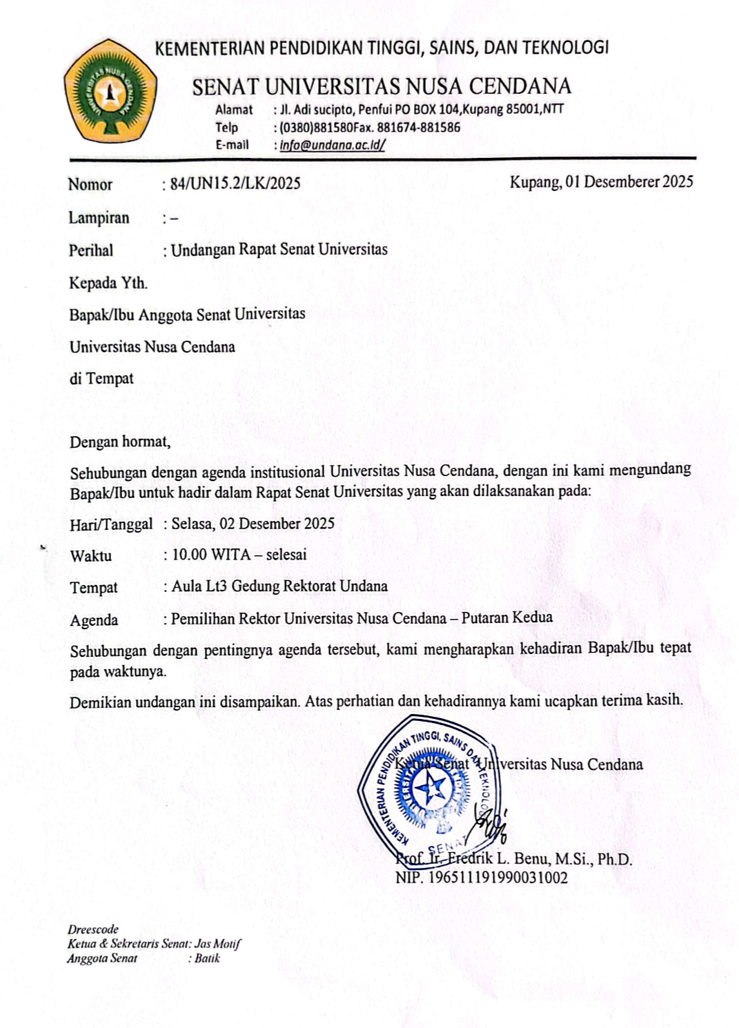 PORTALNTT.COM, KUPANG – Universitas Nusa Cendana (Undana) akan menggelar pemilihan Rektor periode 2025–2029 pada putaran kedua, Selasa (02/12/2025).