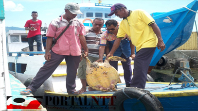 PORTALNTT.COM, LARANTUKA – Anak buah kapal (ABK) motor Kodidore yang melayani penyeberangan penumpang Ongalereng pulau Solor menuju pelabuhan laut Larantuka ibukota kabupaten Flores Timur,pada Kamis(1/12/2016) pukul 10 : 25 WITA, berhasil menyelamatkan seekor penyu sisik (Eremochelys Imbricata).
