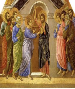 Dalam situasi seakan tak ada harapan lagi ini, Yesus hadir dan menyampaikan salam damai kepada mereka. ”Damai sejahtera bagi kamu”. Menerima salah berati menerima harapan baru. Sesudah berkata demikian Ia menunjukkan tangan dan lambungnya kepada mereka. Murid-murid yang mengalami pengalaman istimewa ini bersukacita karena mereka melihat Tuhan. Yesus bahkan mengulangi ucapan damai itu: “Damai sejahtera bagi kamu”.