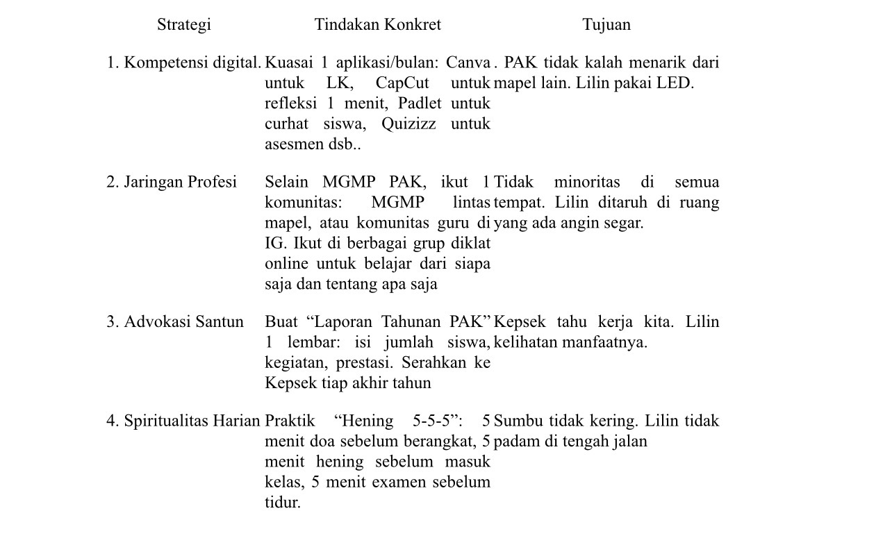 Ciri Inspiratif: Rekan guru bilang, “Untung ada Ibu/Bapak PAK. Yang buat suasana adem.”IV. PENUTUP: PENGUATAN, MOTIVASI, DAN STRATEGI PENGEMBANGAN PROFESI1. PENGUATAN: LILIN INSPIRATIF PUNYA 3 SUMBU