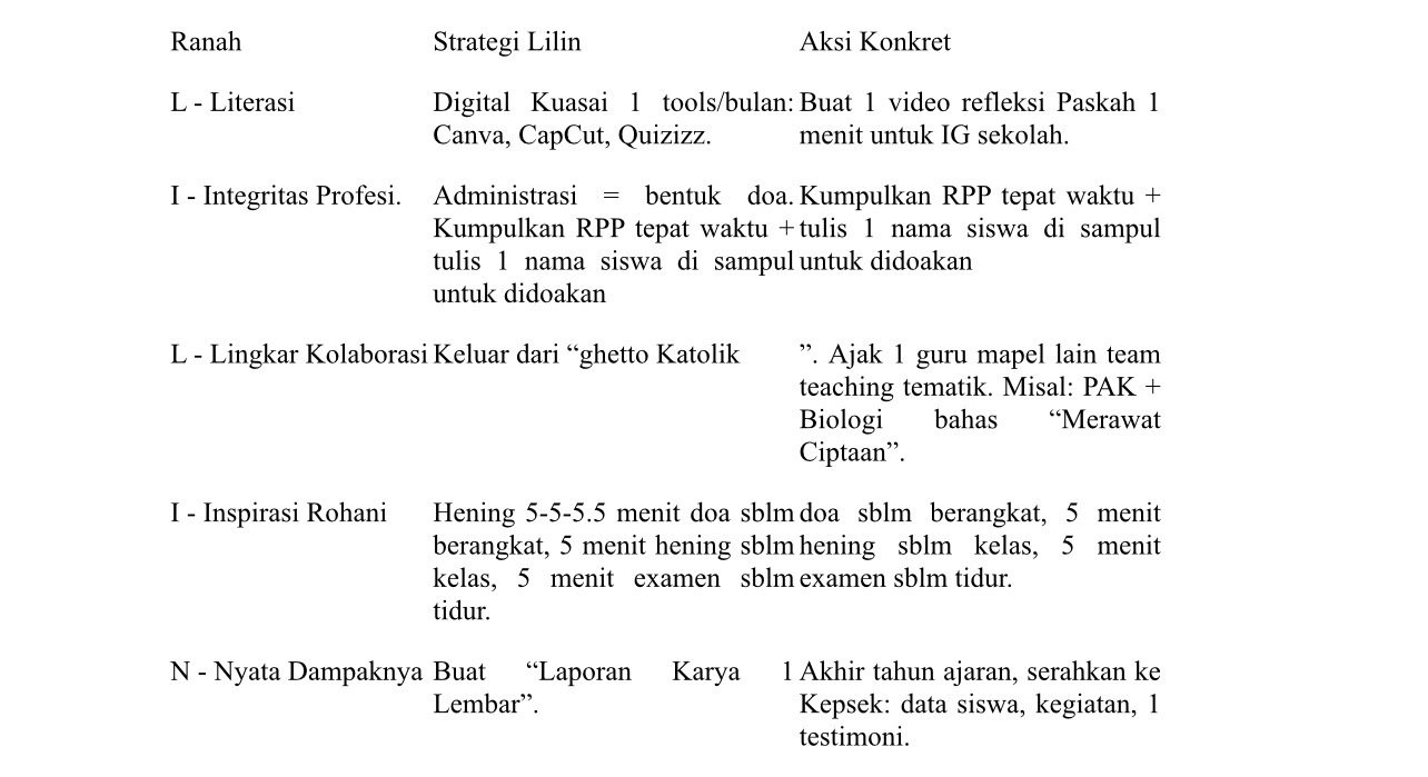b. Melayani Lembaga: Sumbang ide saat rapat kurikulum, terutama pada penguatan Profil Pelajar Pancasila beriman & akhlak mulia. Itu pintu masuk Ajaran Sosial Gereja.