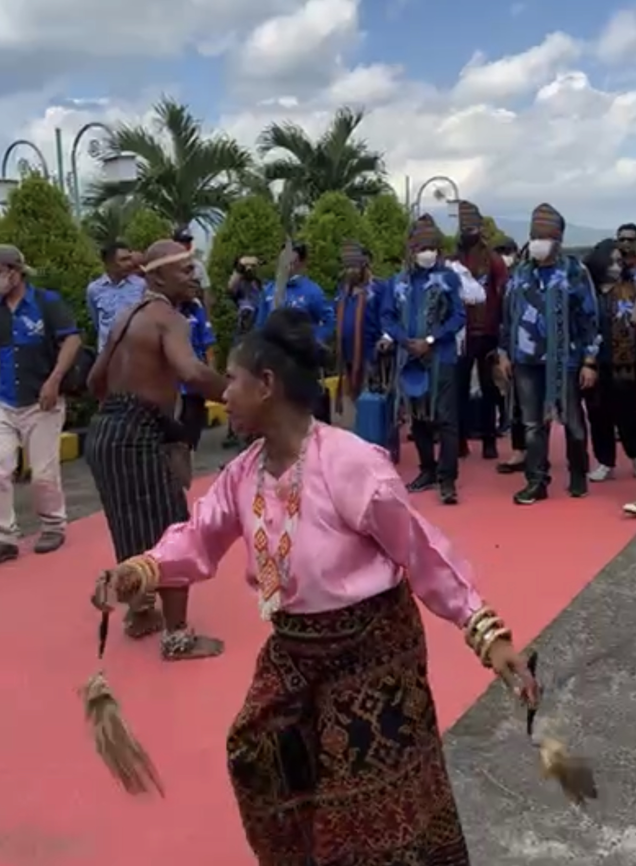 Rombongan Dewan Pimpinan Pusat (DPP) dan Dewan Pimpinan Daerah (DPD) Partai Demokrat tiba di bandara Frans Seda Maumere dan disambut dengan sapaan adat dan tarian Hegong Papak dari sanggar sanggar Nilo Watu Buan.